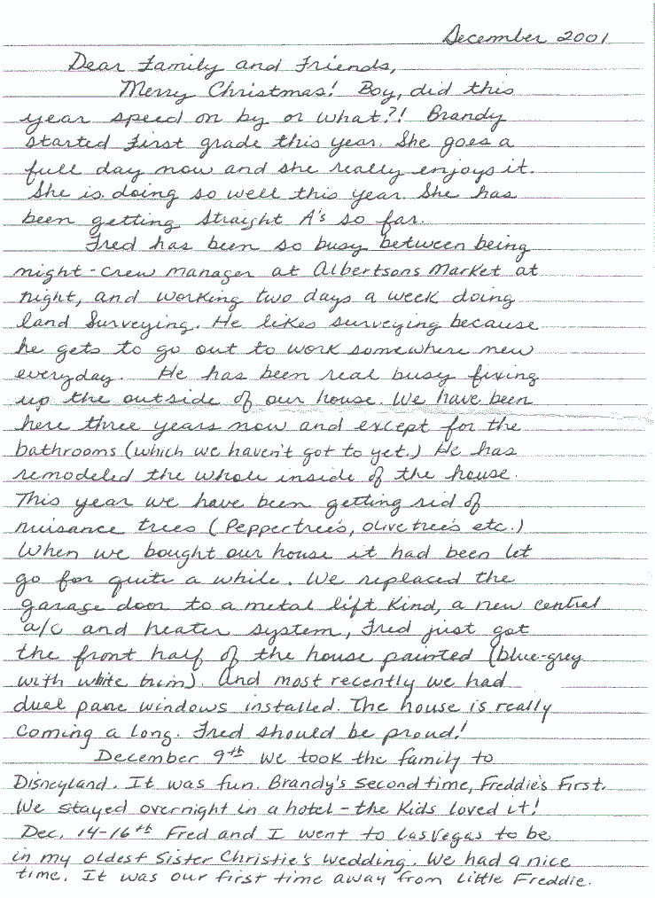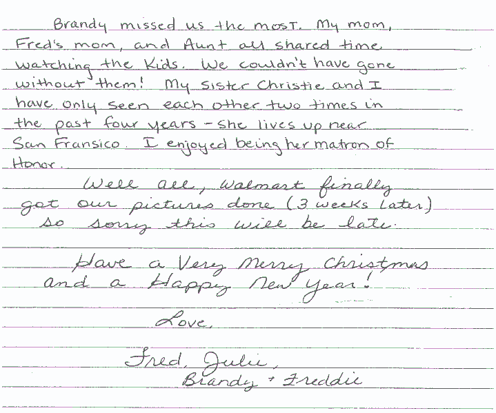 Julie passed away on February 14th, 2002. She was 33 years old. She is survived by her husband Fred and 2 kids, Brandi age 6 and little Freddie age 2.